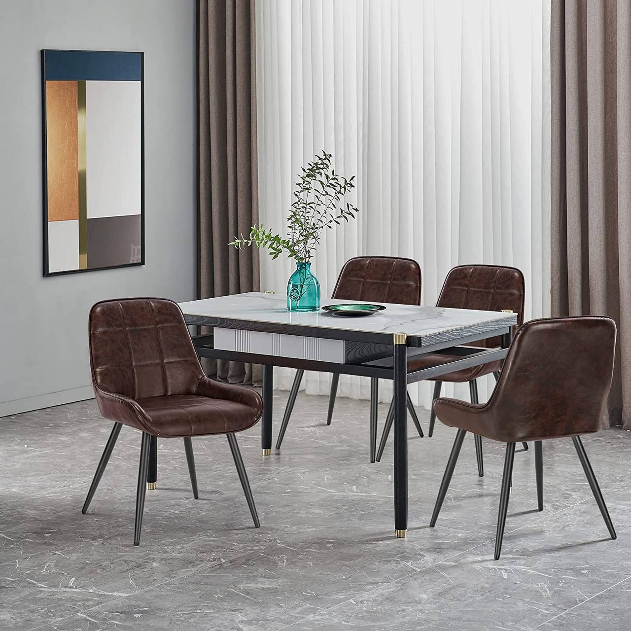 Brūns ekoādas ēdamgalda krēsls. Melnas metāla kājas. Pieejams un apskatāms veikalā. Pieejami pirkumam tikai veikalā Krustabaznicas ielā 11-24.